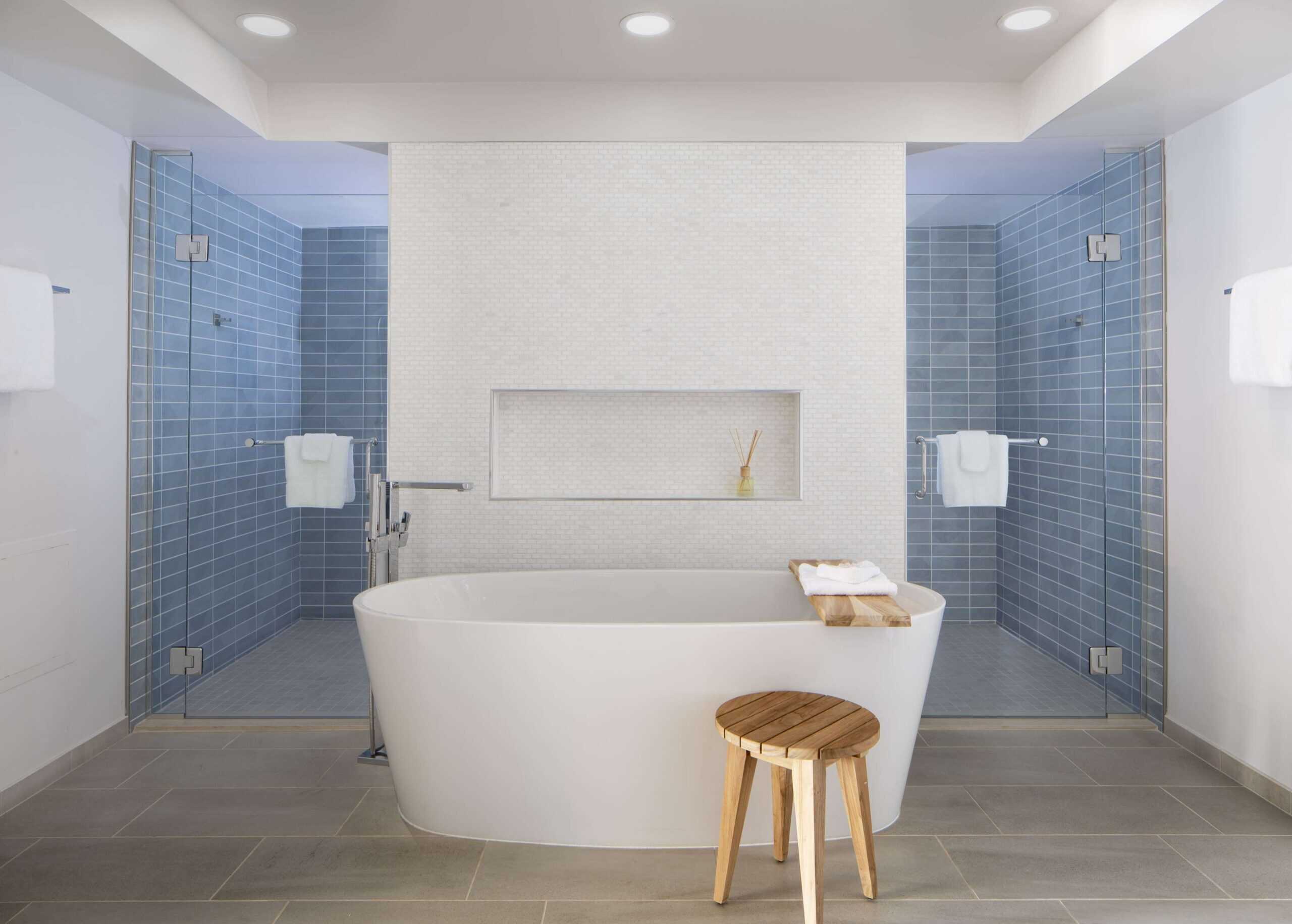 Indulge in the ultimate relaxation within this expansive 2,300 sq. ft. suite, offering breathtaking ocean views from expansive dual balconies. Experience the pinnacle of comfort in this one-bedroom suite, featuring a king-size bed in the upper-level bedroom and a spacious living area with a wet bar and mini-kitchen. Contemporary and unique furnishings, coupled with refined decor, create an atmosphere of sophisticated elegance.