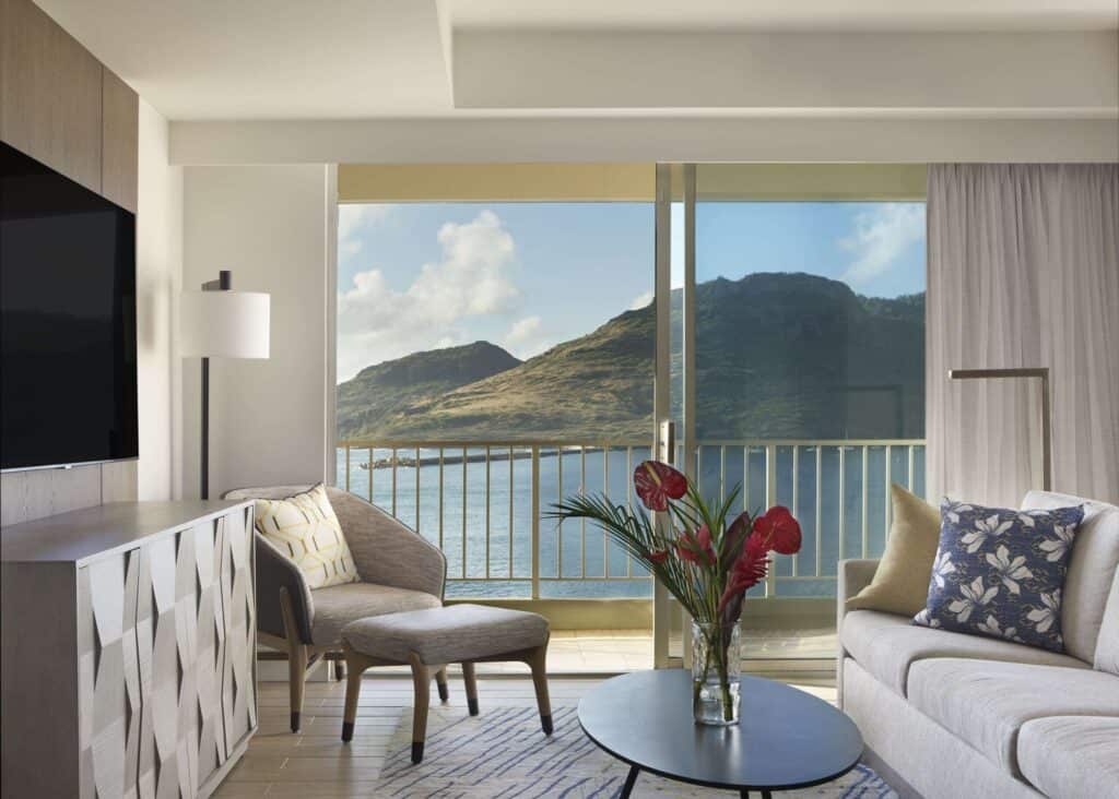 This recently renovated 1,000 sq. Ft. suite offers unparalleled comfort with dual balconies overlooking the breathtaking expanse of Kalapaki Beach and Hawaii’s largest single-level pool. Experience the epitome of refined living with custom hardwood finishes, upscale furnishings, and a spacious layout. The private bedroom features a king-size bed, while the separate living area provides ample space to relax with a sofa bed, comfortable seating, and a dining table.